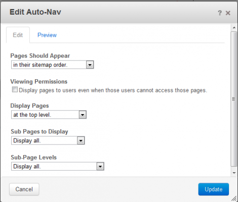 It’s important that you select “Display all” in both “Sub Pages To Display” and “Sub-Page Levels”. When you work with a JavaScript based navigation you usually print all the items into the HTML output, but hide some of them using JavaScript. Click on Update when you’re done and click on the block you modified again, but this time select “Custom Template” and select “Sooperfish” and click on “Update” again.